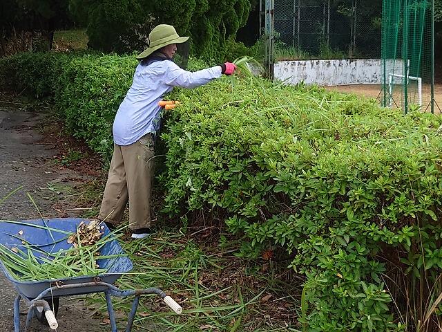 PTA会員の皆さんには、除草作業や草刈り、植木の剪定、窓ふき・網戸ふきなどをしていただきました。フェンスに絡んだ蔓もとっていただきました。