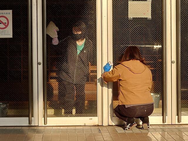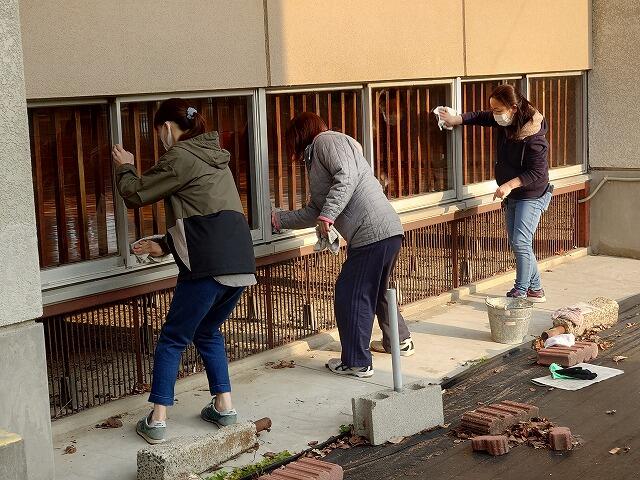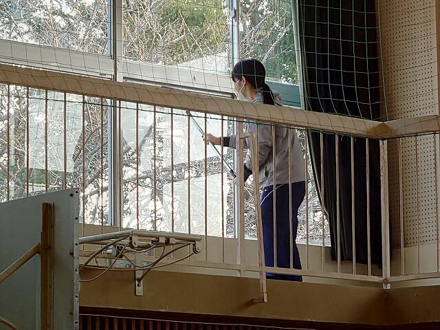 体育館では、窓を丁寧に拭いていただいたり、床の掃除をしていただいたりしました。体育館内が以前より光が入り、明るくなりました。