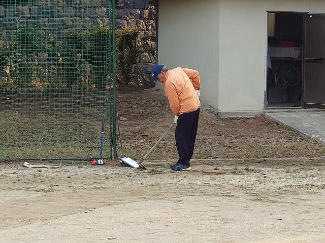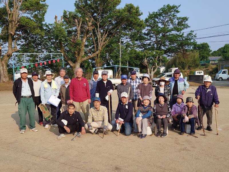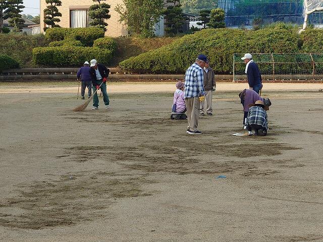 5月15日早朝、部田見上区老人会の皆さんと本校運動場でグランドゴルフをされている皆さんが、美化作業を実施してくださいました。作業内容は、「運動場のフィールド内の除草」や「刈り払機による草刈り」「運動場周縁の落ち葉集め」等でした。