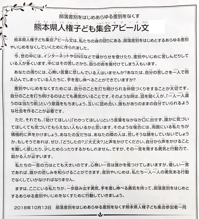10月13日(土) 今日は、パークドームで人権子ども集会がありました。(参加者8000名?)玉水小学校からも12名の児童が参加しました。今年は、白幡小学校、南阿蘇中学校、城北高等学校の3団体が発表しました。「地域の方へ、元気を届けるプロジェクト」や「いじめや差別をなくすための取組」の発表でした。事務局の高校生から、「身の回りにある小さな差別をなくすことから始めてください」というお願いがありました。参加した子ども達は、今日の学びを玉水小学校の取組に生かしてくれると思います。