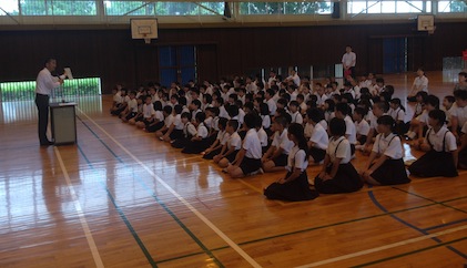 玉水小学校に英語を教えにきてもらっているケーシー先生が今日の最後の授業でした。そこで、体育館で子ども達とのお別れの式をしました。お別れの式で、ケーシー先生が子ども達に挨拶をされ