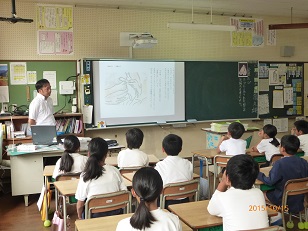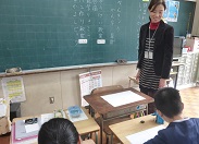 玉名市の学校は今年から「エンジョイイングリッシュ」の時間に英語の学習を1年生から6年生まで行っております。玉水小学校でも朝、10分程度の英語教材を使っての学習を楽しく行っております。今日は教育委員会から3名の方がその様子を参観にこれました。