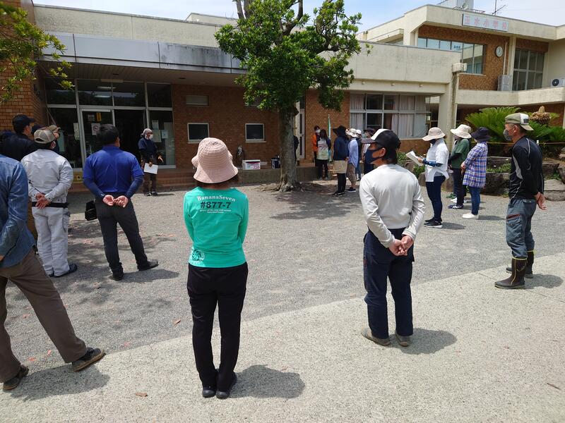 雨上がり後の晴天で、蒸し暑い中での2時間の作業でした。熱中症予防のために今回は、一人当たり2本のペットボトルのお茶を用意していただきました。また、開始1時間後には休憩を入れました。