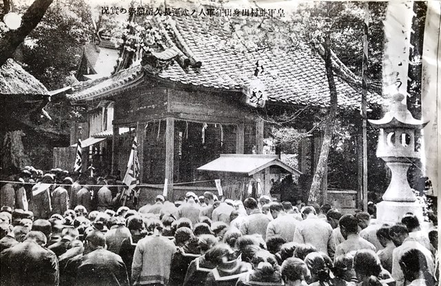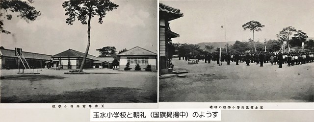 12月7日(金) 玉水小に保管してある昔の写真を紹介します。上の写真は、前の校舎です。中の写真は、その当時の朝礼の様子です。今と雰囲気が違います。下の写真は、戦争中で、兵士の方が写っています。場所は、八社宮なのでしょうか?ご存じの方が折られたら連絡をお待ちしています。上と中の写真は、以前久島区の中山区長さんから頂いた写真にあったものと同じです。