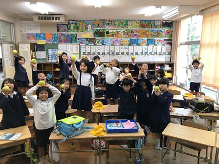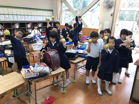 12月7日(金) 今日は一年生がリンゴをもらっていました。みんなうれしそうです。いい笑顔ですね。