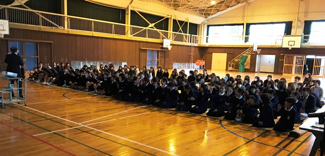 10月25日(木) 今日は、午後に天水中学校の体験入学がありました。学校の概要説明の後、英語と体育の模擬授業やあいさつ運動に対する意見交換会、中学生との交流タイムなどが用意されていました。子供達には、中学校生活に対する貴重な体験となったと思います。