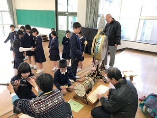 12月10日(月) 今日は、放課後子供教室で雅楽演奏と体験がありました。5年生が一緒に参加させていただきました。音楽の授業で雅楽を学ぶので貴重な経験となりました。写真は、その様子です。