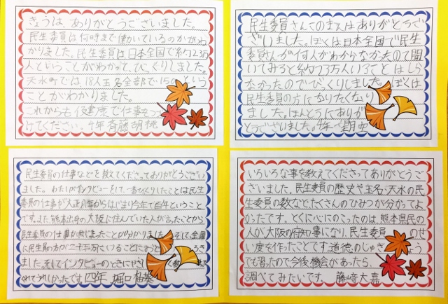 11月1日(水) 下の写真は、昨日の民生員・児童員さんとの交流会で、いろいろ教えていただいたことに対する返しの手紙(お礼の手紙)です。子ども達は、「くまもとの心」で学んだことと結びつけたり、民生員としての思いや民生員の歴史など、多くの学びを得たようです。