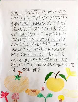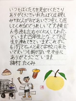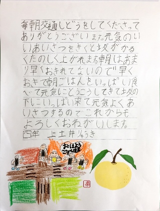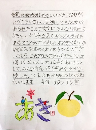 11月6日(月) 毎朝交通指導に立って下さっている主任児童員の鶴窪さんと民生員・児童員の西村さんに子ども達がお礼の手紙を書きました。お二人は、後期になってからは、南坂と北坂登り口に分かれて指導して頂いています。本当にありがとうございます。