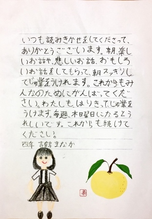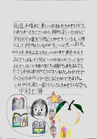 11月10日(金) 毎週木曜日に地域のボランティアの方に読み聞かせをして頂いています。いつもいろいろな本を工夫して選んで頂き、子ども達は、とても楽しみにしている活動です。4年生の子ども達がその感謝の気持ちを込めてお礼の手紙を書きました。紹介いたします。