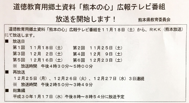 11月13日(月) 道徳教育用郷土資料「熊本の心」広報テレビ番組が11月18日(土)から、RKKで放送されます。詳細は学校からのお便りにアップしています。ご家庭でも是非ご覧になって話題にして下さい。