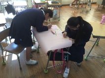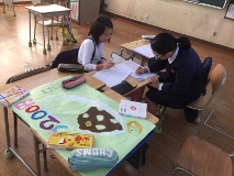 11月16日(木) 昼休み 有志によるPTAバザーへの協力の取り組みの様子をお伝えします。6つのグループに分かれ、看板づくりと販売時の工夫に取り組んでいます。服装や呼び込みの工夫などを考えています。写真は、看板の見え方をお互いに意見を出しながら検討しているところです。