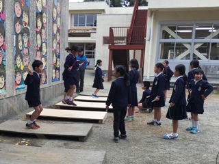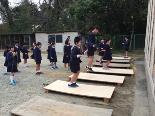 12月12日(火) 昼休み ジャンプボードをお披露目しました。これは、先日のPTAバザーの収益金を使って作成したものです。子どもたちも喜んで縄跳びの練習に取り組んでいました。写真はその様子と、角材を加工している教頭先生です。