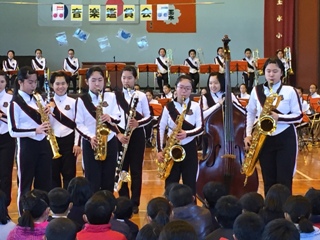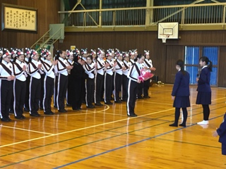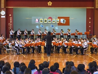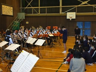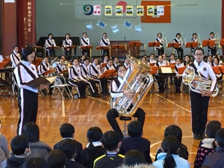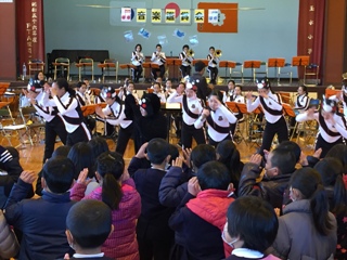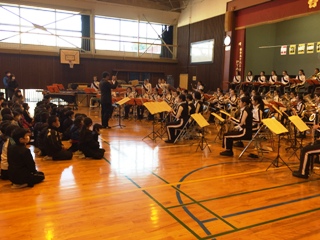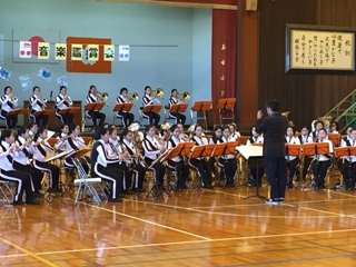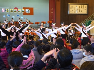 12月13日(水) 5校時 玉名女子高等学校吹奏楽部を招いての演奏会を開催しました。学校の授業や行事、教育実習、遠征など、忙しい合間を縫っておいでいただきました。演奏会は、ディズニーメドレー等のすばらしい演奏はもちろん、楽器の紹介や熊本復興を願っての「花は咲く」、ぬいぐるみやお面をかぶった「くまもん体操」まで用意していただいてました。子どもたちも大喜びで本当に楽しい感動の時間を過ごすことができました。ありがとうございました。