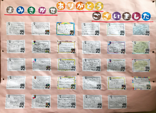 1月2日(火) 読み聞かせは、5月16日(火)から毎週木曜日に実施しています。地域・保護者の方の協力で、子ども達も大変楽しみにしています。子ども達が、今まで読み聞かせしていただいたお礼の気持ちを込めて、言葉を記しました。地域の方のご協力に大変感謝しています。ありがとうございました。