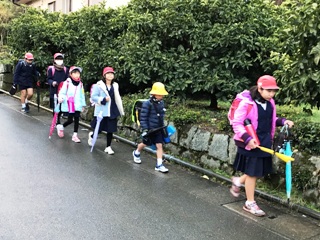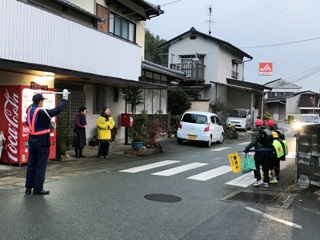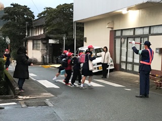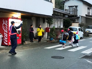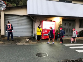 1月10日(水) 南坂下の登校の様子です。寒い中、子どもたちは、元気に登校しています。ちらほら、遅れてきている子どももいます。集合時刻を守って登校できるよう頑張りましょう。南坂では、主任児童員さんに登校指導をしていただいています。