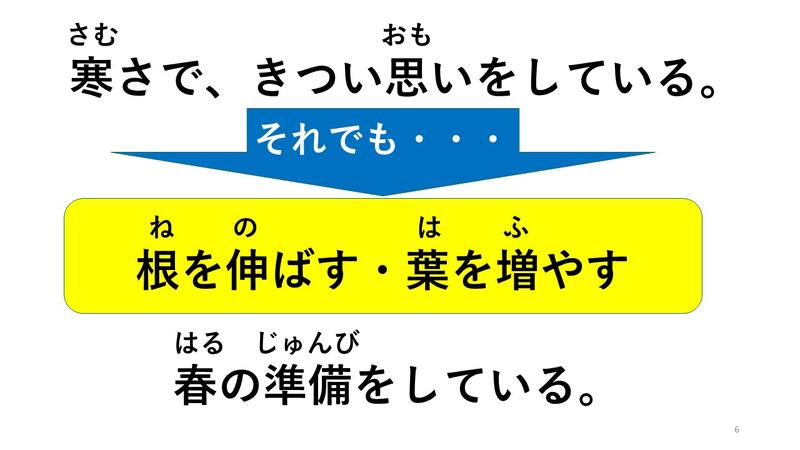 皆さんも、花たちのように寒さやきつさに負けず、4月の準備、春の準備をしていきましょう。