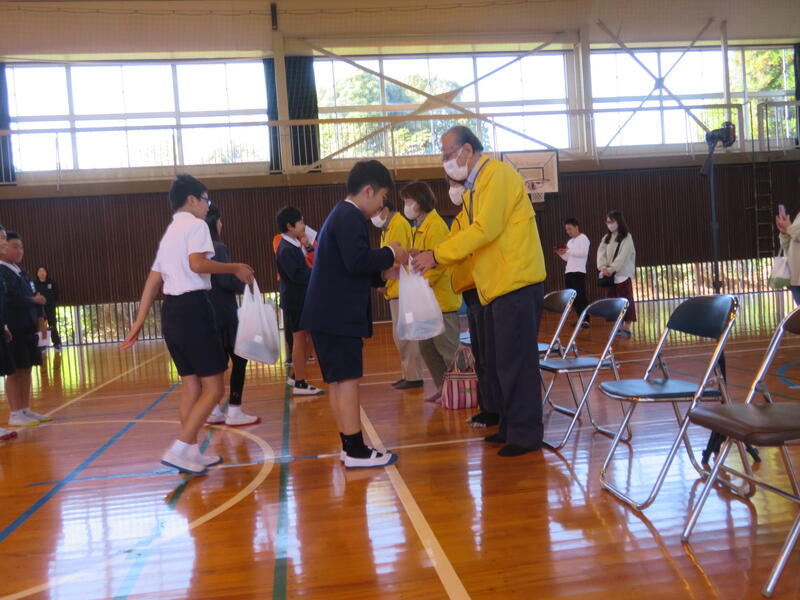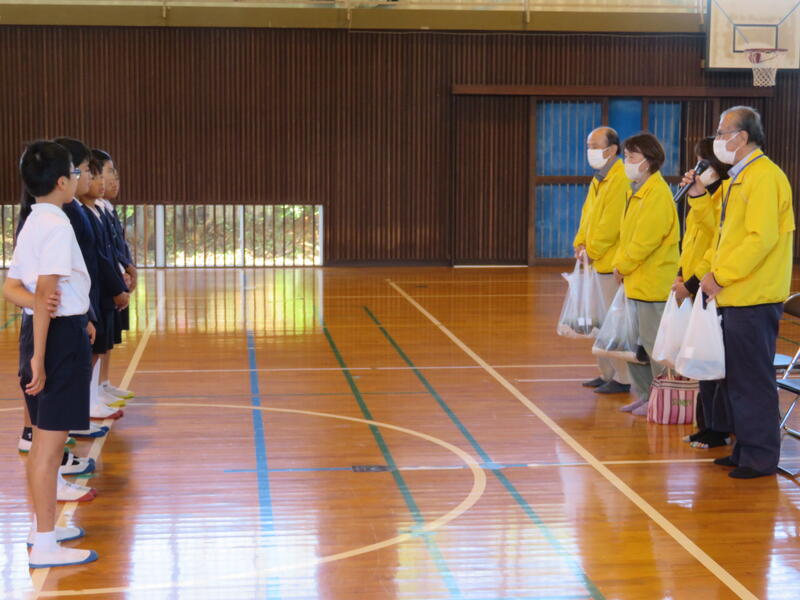 近くの保育園には、本校児童が利用する学童保育の施設もあります。本校児童がお世話になっているお礼として贈りました。保育園では、4人の園児が代表として受け取ってくれました。