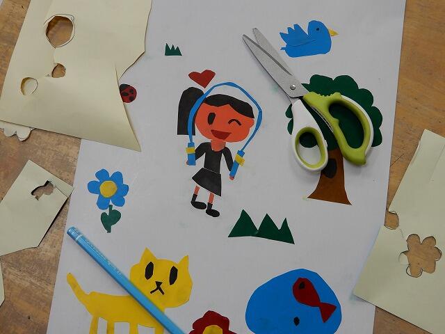 子供たちは、専用の色紙を思い思いにハサミで切って、台紙の上に並べていきました。