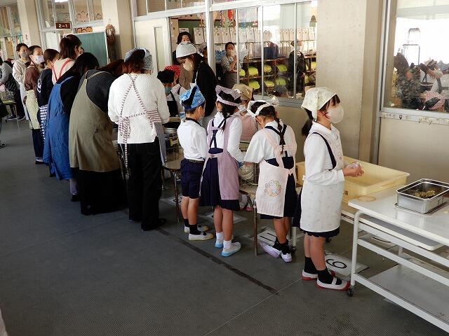 給食の準備は、子供たちと保護者の方と一緒に行いました。その後は、試食です。