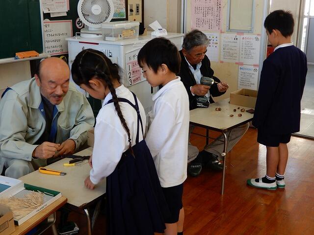 11月19日、1年生が「あきのおもちゃづくり」をしました。どんぐりに穴をあけるので、地域の方お二人にも応援に来ていただきました。