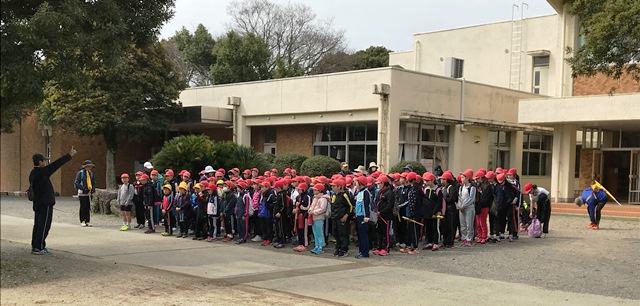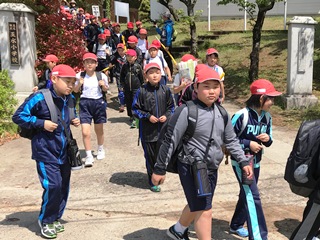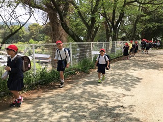 4月18日(水) 今日は歓迎遠足で、旧天水中学校跡地に出かけました。すばらしい天気で,歩いていると汗ばむほどの暖かさでした。出発前に熊本地震から学ぶことをと歓迎遠足の目的を話して出かけていきました。まず出発の様子です。