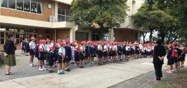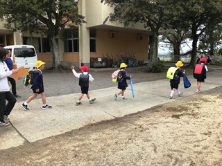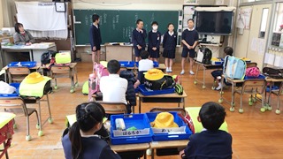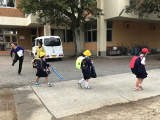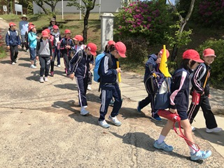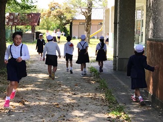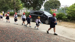 5月1日(火) 一斉下校の様子です。企画委員の子供達が進行をしています。帰っている様子は、運動場側に帰る子供達で、1年生のいる班です。学童に通っている子供達がいるので、人数が少なくなっています。