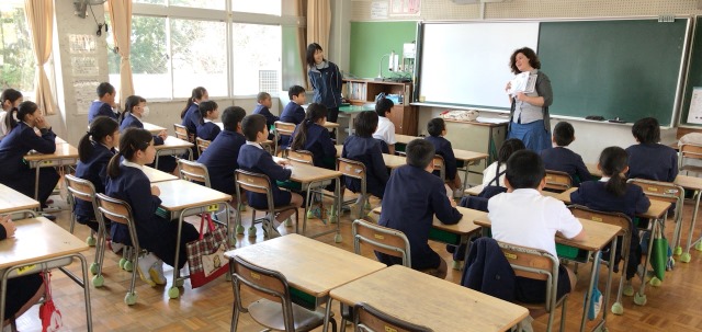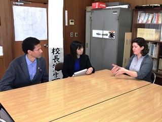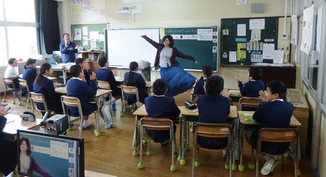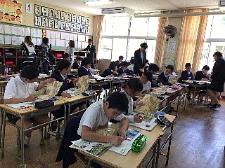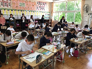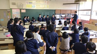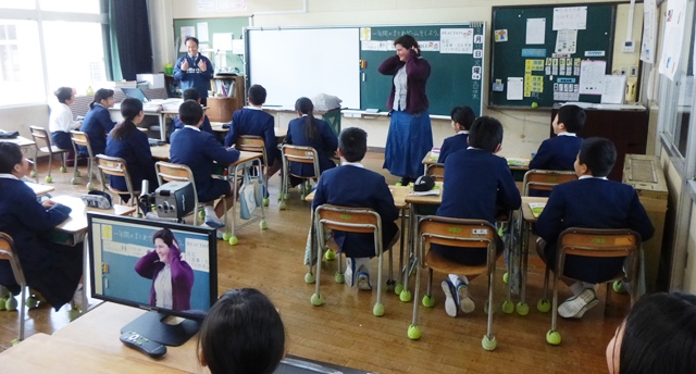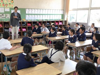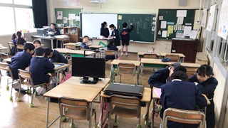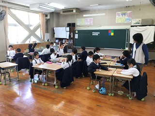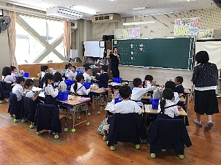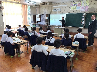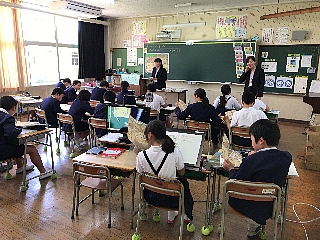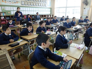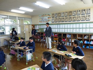 3月13日(火)今日は2・3校時にALTのモーガン先生が、玉水小の4年生・5年生で指導をされる様子を来年度新しくALTになられるコール先生が参観されました。コール先生は身長が190cmと大きく子供達も驚いていました。終わったとは、校長室で指導法の確認や打ち合わせが行われました。子供たちは、初めて会ったコール先生や柳井指導主事にも進んで話しかけ、今まで学んだフレーズが出てくるとしっかり受け答えができたのでほめていただきました。写真は、5年生4年生の授業の様子です。
