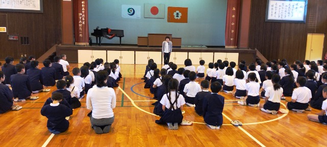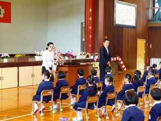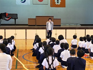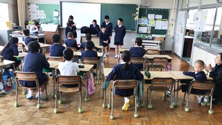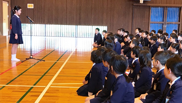 3月26日(月) 本年度の3月31日をもって本校を転出する児童がいます。4年生の齊藤悠月さんです。3月22日(木)の修了式終了後、お別れのあいさつをしてもらいました。とてもさみしくなりますが、4月から通う玉名町小学校でもきっと頑張ってくれると思います。写真は、その時の様子です。