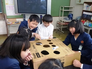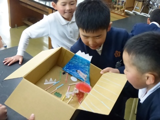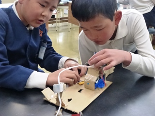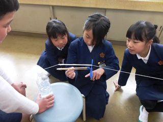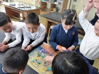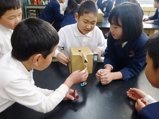 3月12日(月)3年生理科「つくって遊ぼう」の様子です。3年生で学んだ理科の内容(かぜ、電気、磁石、ゴムなど)を使って、おもちゃ作りをして遊んでいる様子です。子供達の表情はとても生き生きしていて楽しそうに活動していました。