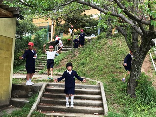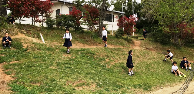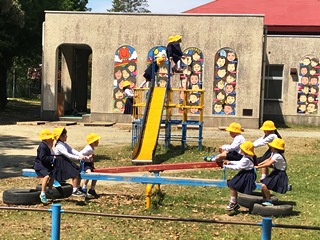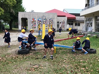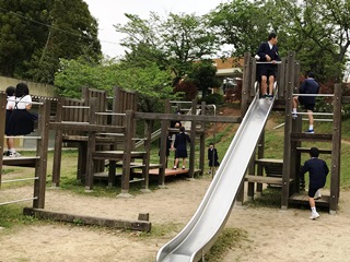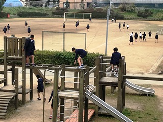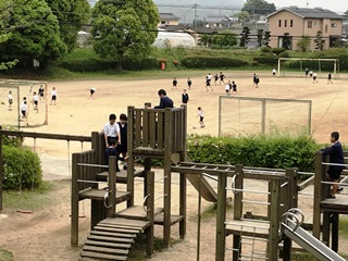 4月26日(木) 1時間目の休み時間、1年生の子ども達が、シーソーやジャングルジムで楽しそうに遊んでいました。写真に撮ろうとしたそのとき、チャイムが鳴りました。子供達は、その瞬間一斉に教室へ走り出しました。感心しました。
