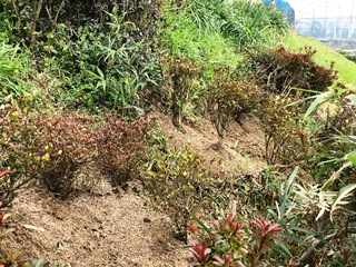 3月15日(木)玉水小学校には、ツツジで作った玉水の文字があります。竹が進入していたので、取り除き始めたところ、文字が読み取れなくなりました。そこで、昨日ツツジを10本植栽し復旧をはかったところです。教頭先生と二人で頑張りました。砂や水を20回ほど運び上げ、どうにか終了しました。しっかり育ってくれるとよいのですが・・・