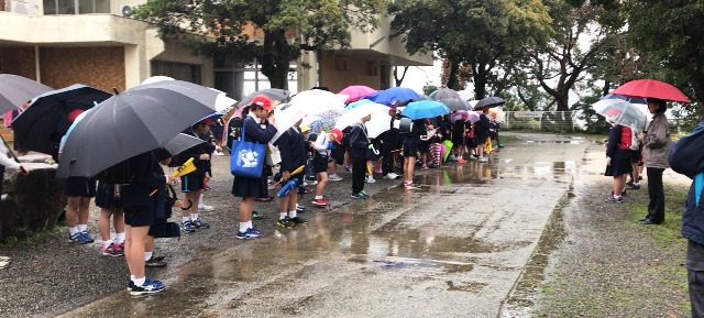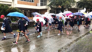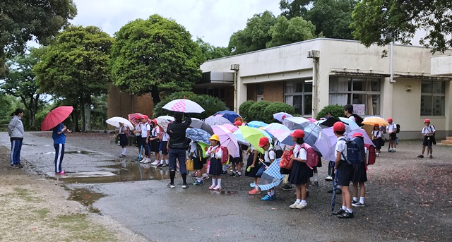 雨の中の一斉下校