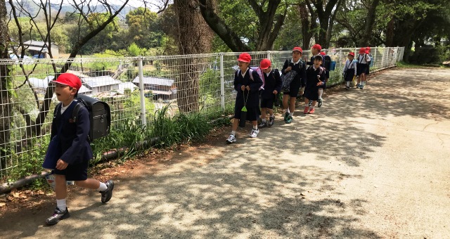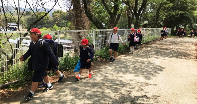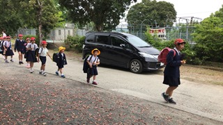 4月9日に(月)今日は、56年生が入学式の準備で遅くなるので、4年生以下が一緒に下校しました。写真は、その様子です。