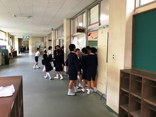 4月27日(金) 最初の写真は、2校時に校長室の前を1年生が通り過ぎていく時の様子です。生活科で学校探検をしている途中でした。みんな笑顔で挨拶をしてくれました。とてもかわいいです。次の写真は、帰りの用意をしているときの様子です。一斉下校に遅れないように,みんな必死で頑張っていました。なかなか大変です。