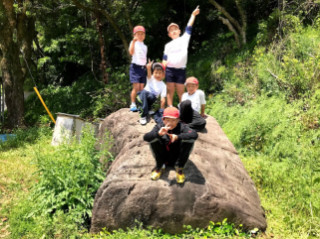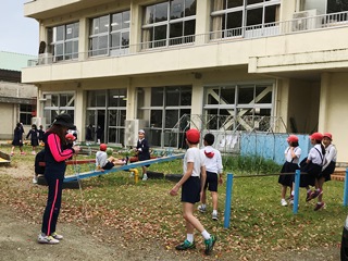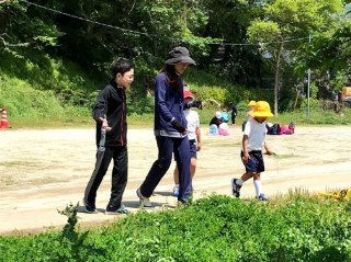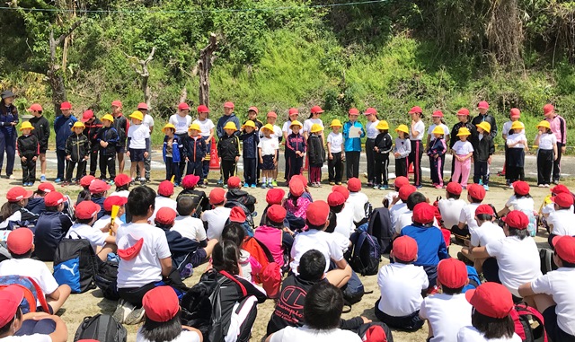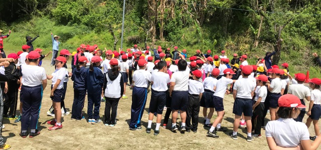 4月18日(水) 天水中学校跡地に到着した後は、6年生が中心になり歓迎会が行われました。まず、1年生が自己紹介をし、付き添っている6年生も付け加えて紹介をしてくれました。その後、〇✕クイズや猛獣狩りに行こう等のゲームで楽しい時間を過ごしました。