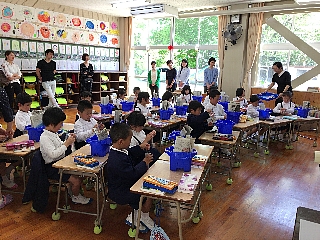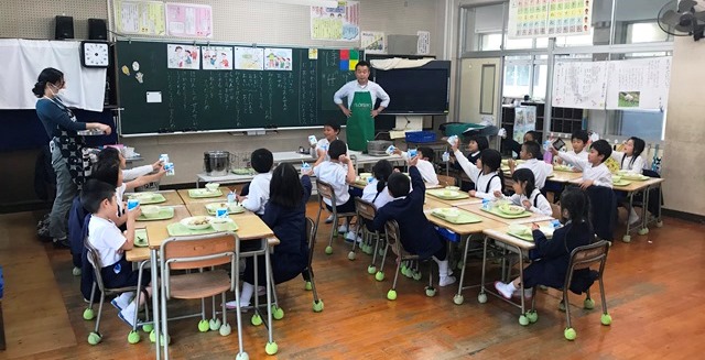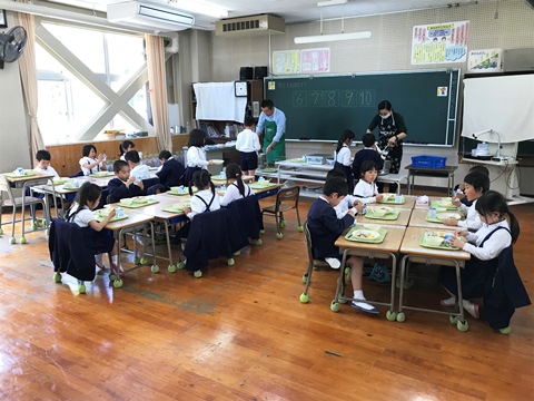 5月8日(火) 今日は1年生の給食の様子です。誕生日の子供が前に出て、牛乳乾杯が行われていました。みんな楽しそうでした。