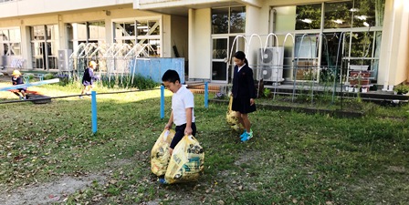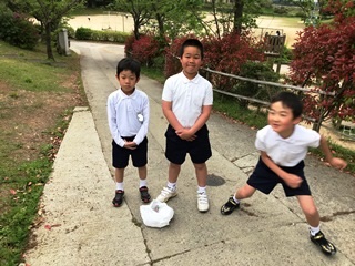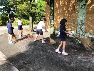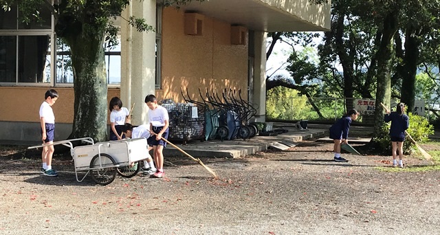 5月9日(水) 今日は久しぶりの晴天で、気持ちのよい朝でしたが、学校は昨日までの雨で、木の葉や枝がたくさん散っています。それを4年生がボランティアできれいにしてくれていました。