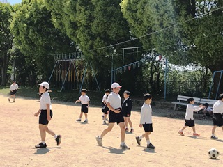 4月17日(火) 朝の様子です。子供達は、運動場や中庭で楽しそうに遊んでいました。短距離走をしているグループ、サッカーをしているグループ、どっぢぼーるをしているグループ、ウッドステーションで遊んでいるグループ、シーソーで遊んでいるグループ、写真にはありませんが、フリスビーで遊んでいるグループや鬼ごっこをしているグループもありました。