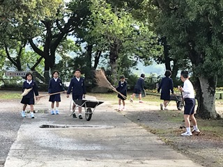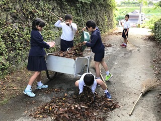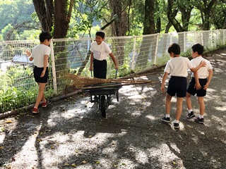 4月25日(水) 朝、登校すると、1昨日刈っていた草が、昨日の雨で流され散乱していました。そこで、4年生の子ども達が活躍してくれました。量が多すぎて全部はできませんでしたが、子ども達のがんばりできれいになりました。