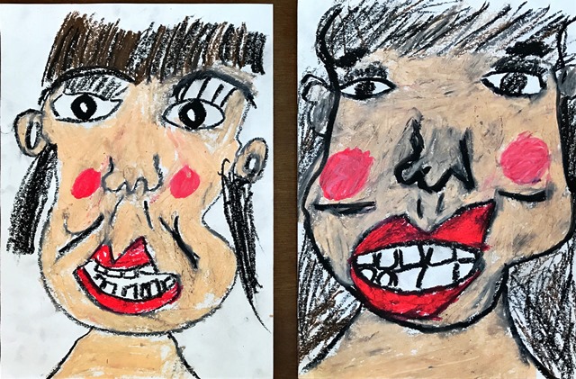 4月26日(木) 1時間目の授業を見て回っているときに教室の掲示物に目がとまりました。1年生の「お日さまの絵」と2年生の「似顔絵」です。みんなのびのびと豪快に書いているすばらしい作品です。4作品ずつ紹介します。