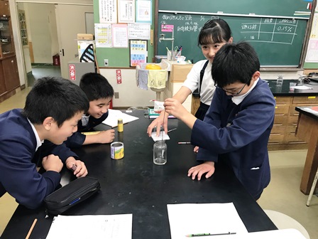 5月8日(火) 授業を見て回っていると、子供達が理科の実験に取り組んでいました。火を燃やして、二酸化炭素や酸素濃度がどのように変化するか確認する実験のようでした。