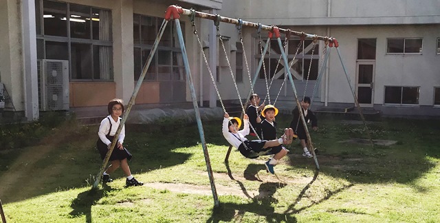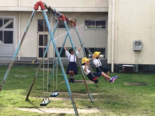 5月10日(木) 朝の様子です。今日も1年生がブランコで遊んでいました。上級生が優しく見守っていました。
