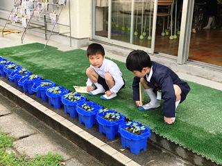 5月9日(水) 交通指導の後、職員室に帰っていると、1年生が2人ブランコに乗っていました。それを、3年生が1人見守ってくれていました。また、教室の前では、朝顔の子葉の観察をしている子供もいました。教室の中では、荷物の整理を多くの子供達が整理していました。