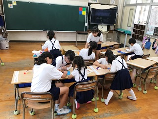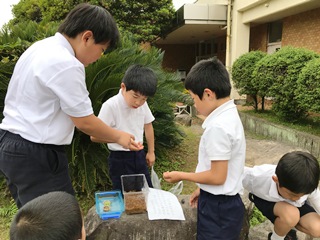 5月17日(木) 今日は、朝クワガタのお世話をしていた子供達の紹介です。児童玄関の入り口に座り込んでまで、意見交換をしていました。真剣な表情がいいですね。