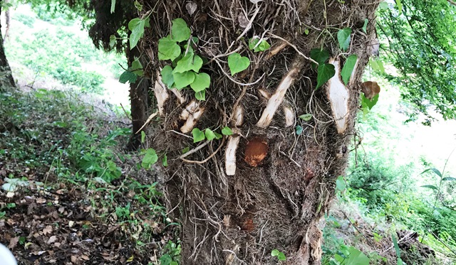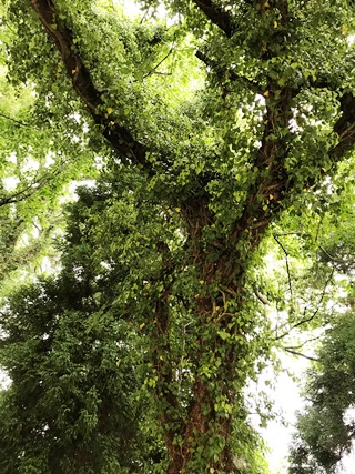 5月18日(金) 玉水小学校にはたくさんの桜の木があり、3月末には、きれいな花を咲かせてくれるのですが、何本か蔓に侵蝕?されているものがあります。その中で1本は、8割方、覆われてしまっていました。写真は、その様子と木の幹に巻き付いていた蔓をのこで切り落としたところです。結構手強い蔓でした。