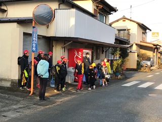 2月13日(火)今日からあいさつ運動でした。小山・久島の子供達が北坂登り口で行いました。玄関前では、立花の子供達です。写真は、北坂登り口の様子です。