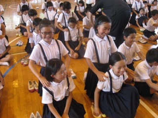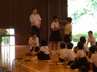 7月3日(月) 5校時 児童集会を行いました。進行は企画委員会が行い、内容は「今月の歌」「委員会からの発表」「今月の音読」「5年生の発表」「心スキルタイム」です。写真は、5年生が水俣病の学習や環境学習から学んだことを4つの班に分かれ、劇を交えて発表しているところです。参観した先生方から素晴らしい発表だったと賞賛の声が上がっていました。「心スキルタイム」では、子供達が、お互いにスキンシップを取りながらコミュニケーションを図っているところです。(上2枚の写真)