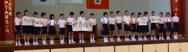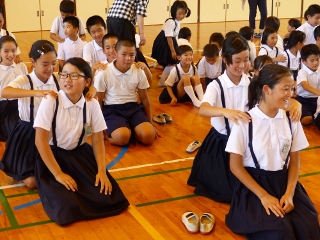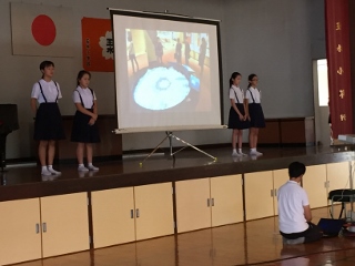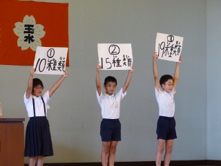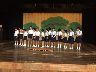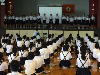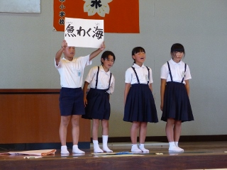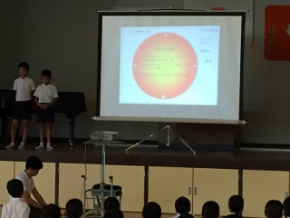 9月25日(月) 5校時 児童集会がありました。今回の中心は、6年生の「修学旅行で学んだこと」の発表でした。長い文をほとんど覚え、原稿も見ずに力強く発表してくれました。聞いている子ども達も真剣な表情で聞いていました。戦争の悲惨さや平和の大切さ、もう二度と戦争を起こしてはいけないという訴えが伝わったと思います。写真は、発表をしている6年生の様子と進行してくれた5年生の企画委員です。