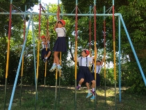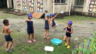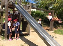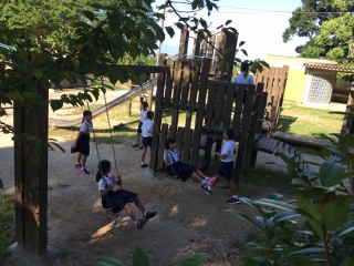 8月31日(木) 昼の運動場です。朝より一段と暑さが増していましたが、子ども達は、大勢運動場で遊んでいました。ウッドステーション、キックベース、登り棒、鬼ごっこ、多くの種目で大勢の子ども達が汗びっしょりになって遊んでいました。アブラゼミも暑そうに鳴いていました。